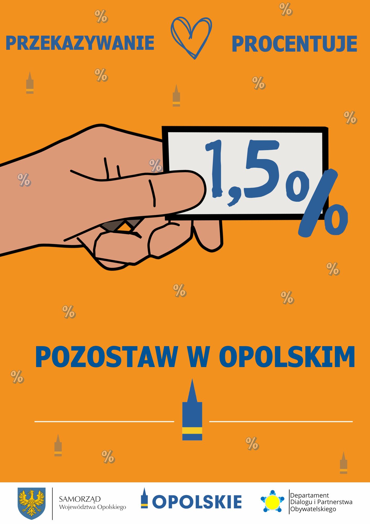 Plakat akcji Pozostaw 1,5 % w Opolskiem. Grafika przedstawiająca dłoń trzymającą karteczkę z liczbą 1,5%. Tło pomarańczowe. Na dole plakatu logoo Opolskiego - Wieża Piastowska w kolorze granatowo-żółtym.